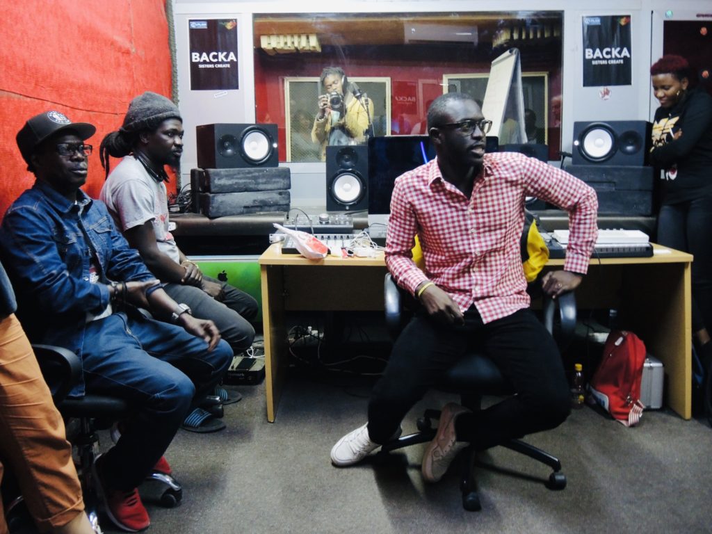 Studio d’enregistrement d’Africulturban, avec le rappeur Matador (premier à gauche, fondateur), Pikine